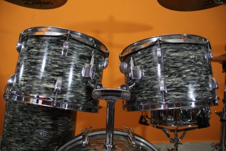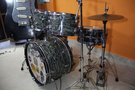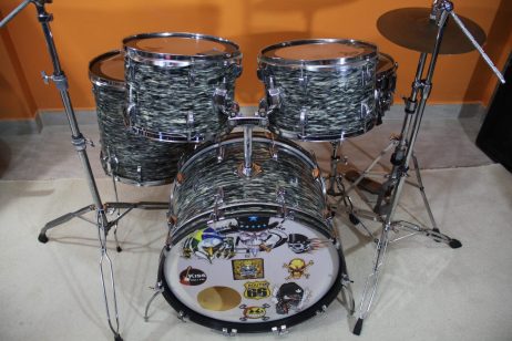 Bateria Pinguim Rajada cinza – Medidas tons 13 pol, surdo 16 pol, bumbo 22 pol e caixa 14 pol.