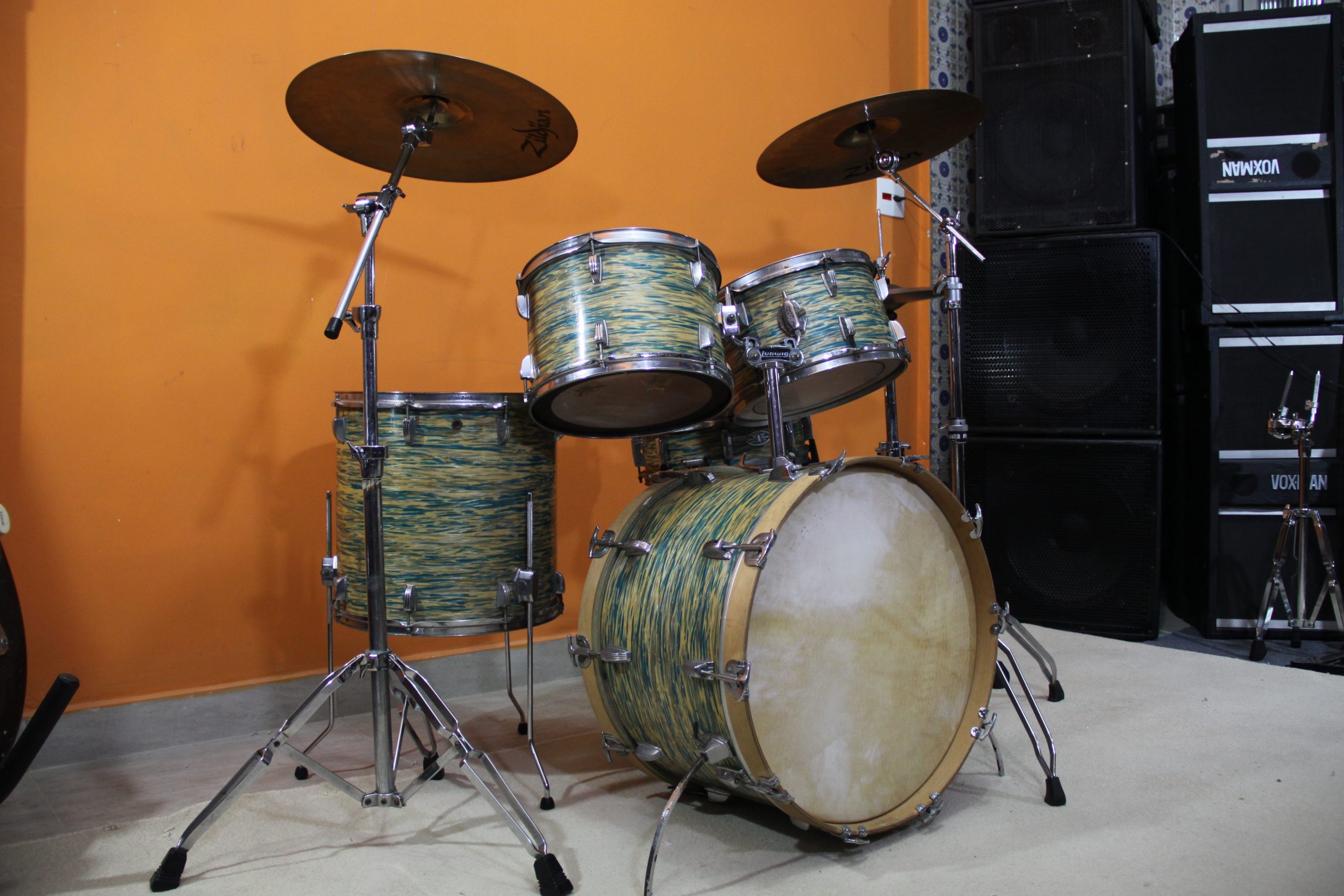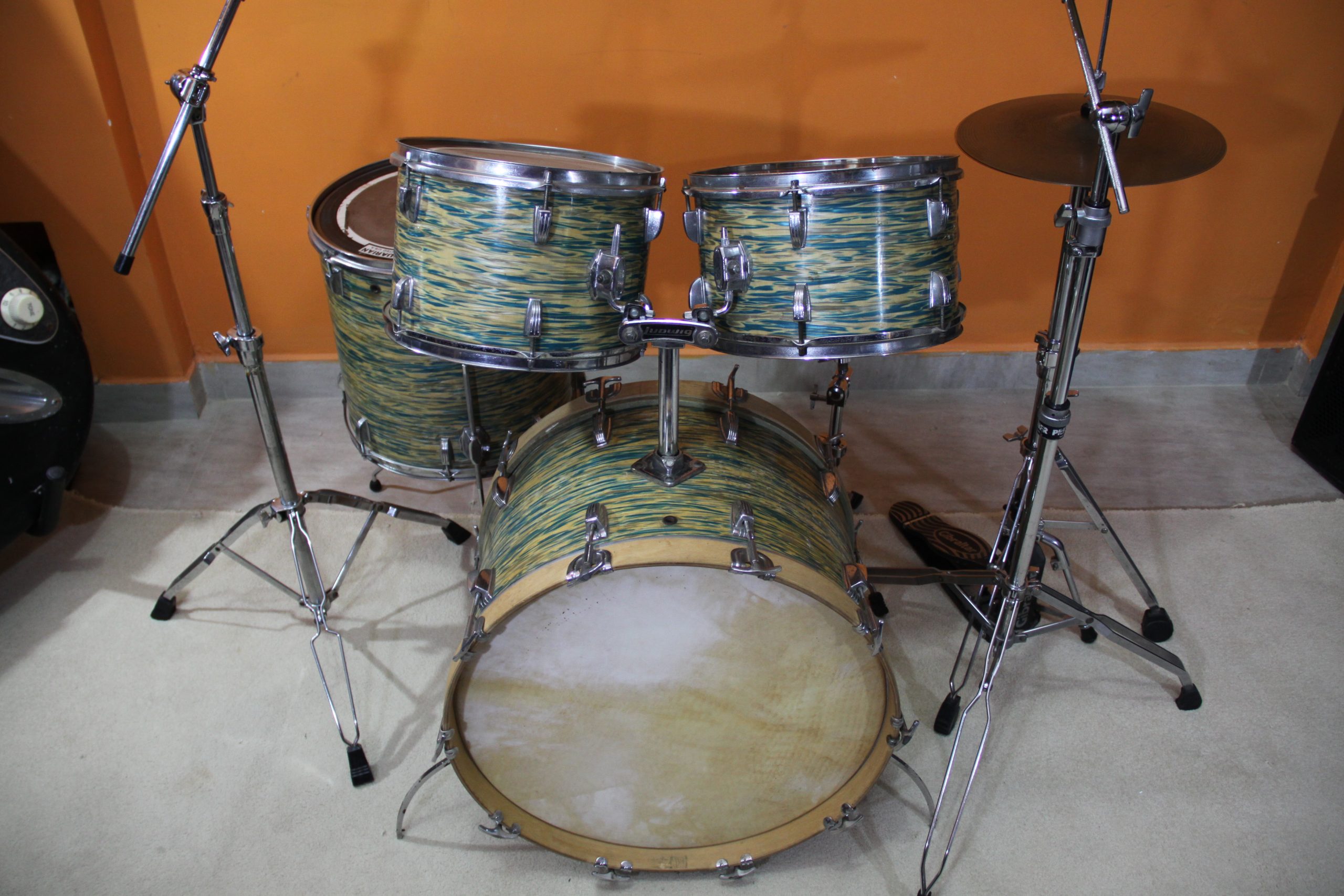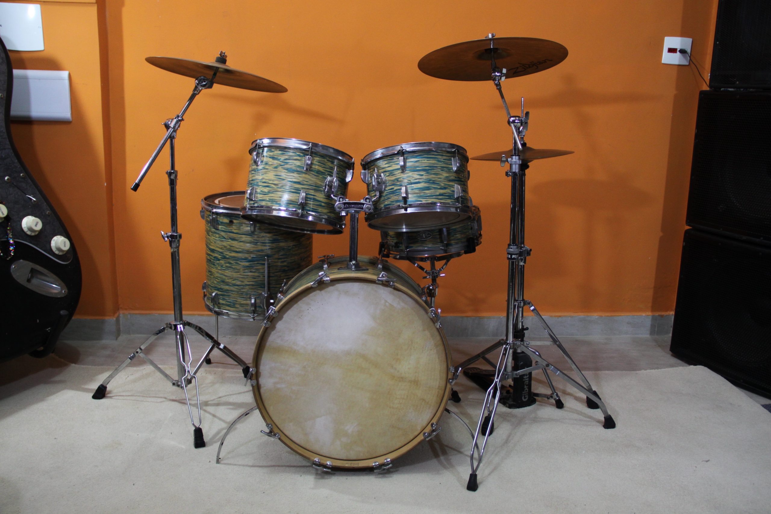 Bateria Pinguim tricolor rajada – celuloide – vintage – Medidas tons 13 pol, surdo 16 pol, e bumbo 22 pol, caixa 14 pol.