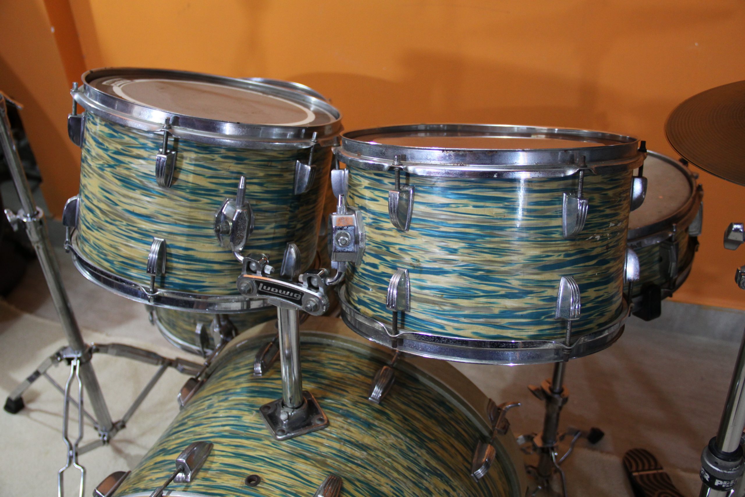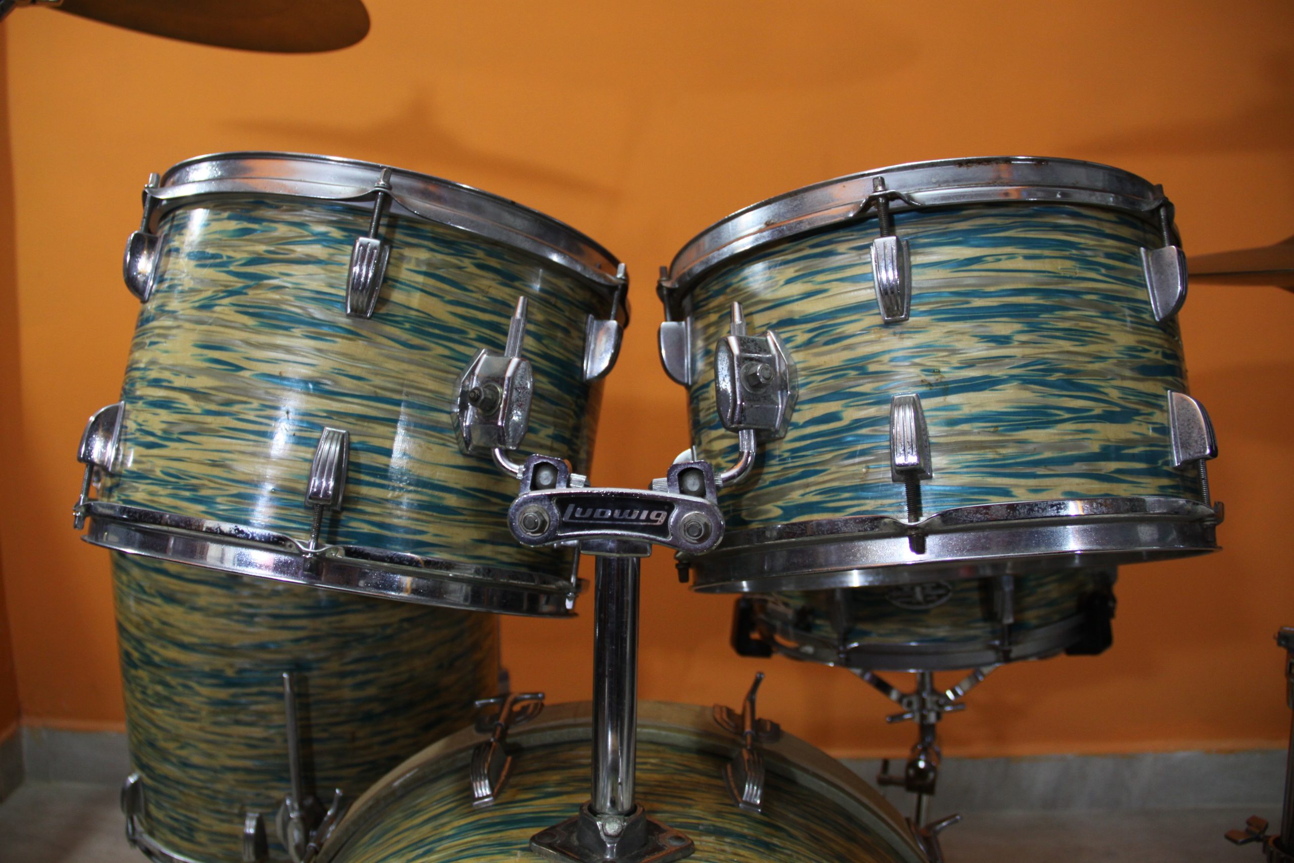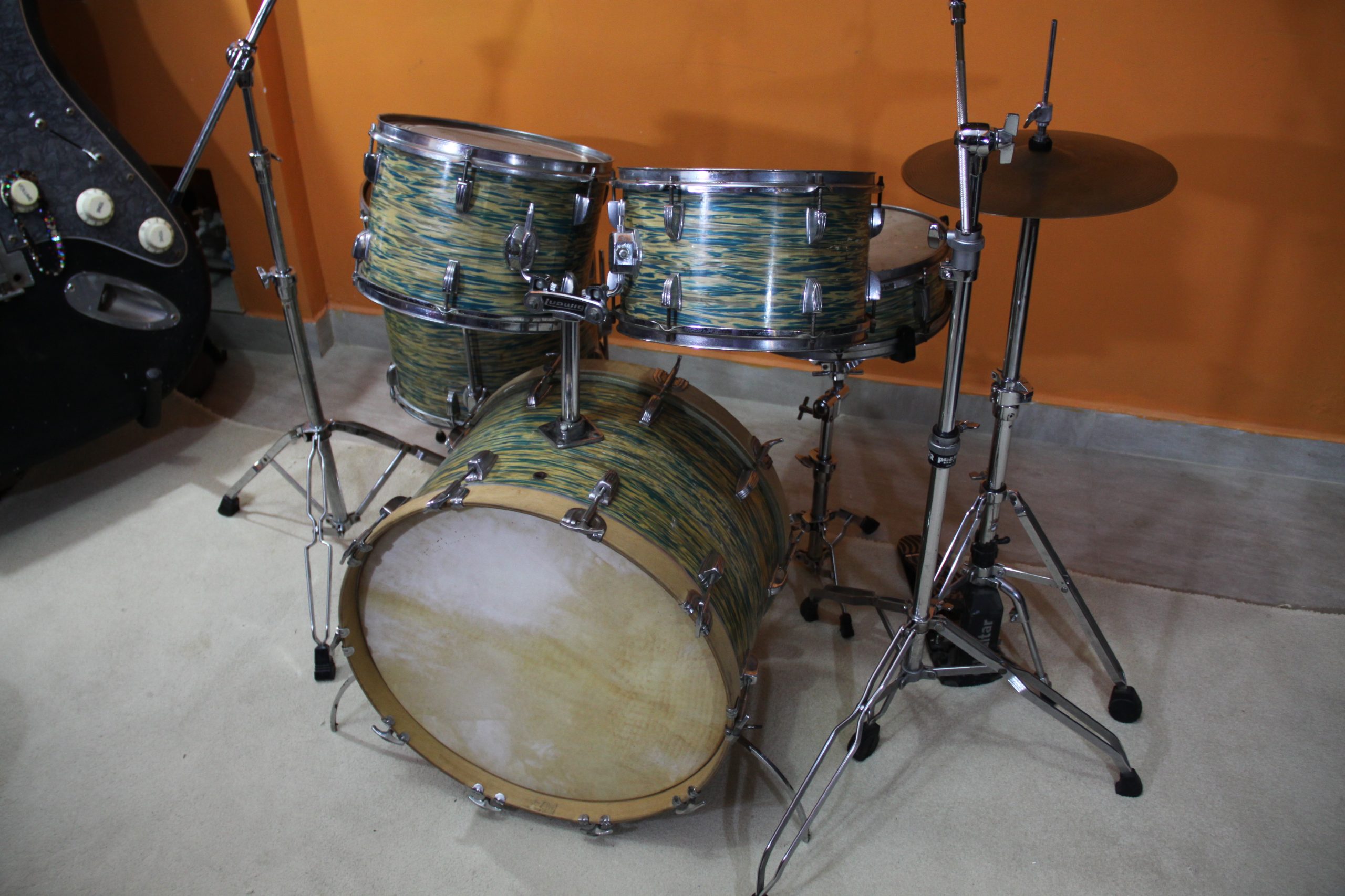 Bateria Pinguim tricolor rajada – celuloide – vintage – Medidas tons 13 pol, surdo 16 pol, e bumbo 22 pol, caixa 14 pol.